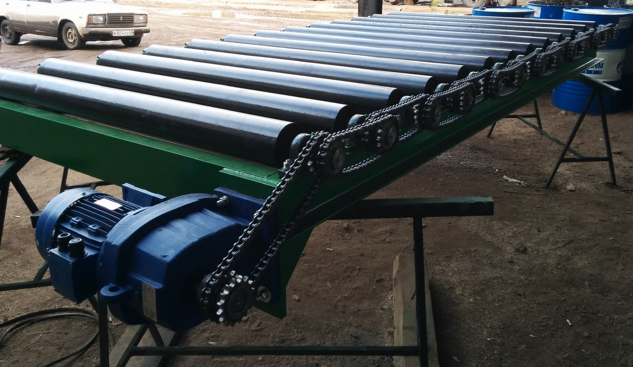 Для изменения угла наклона рольганга стойки выполняют выдвижными. В большинстве случаев ролики имеют цилиндрическую форму и вращаются на подшипниках на неподвижных осях. При транспортировке грузов цилиндрической формы (к примеру, труб, круглого проката и т.д.) применяют коноидальные либо парные наклонные ролики. Парные ролики также устанавливаются также в тех случаях, когда груз перемещается цепью с захватами - цепь располагается вдоль конвейера в просвете между роликами. Обечайки роликов обычно выполнены из стальной трубы.